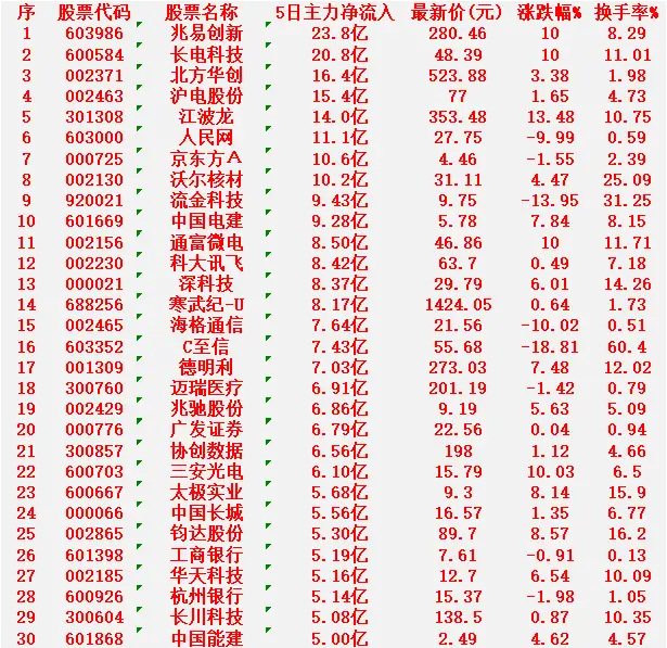 兆易创新:5日净流入23.8亿元,现价280.46元,涨停