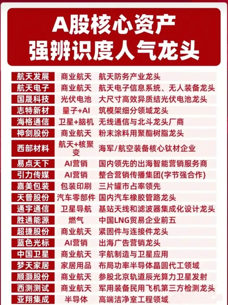 全面梳理A股核心资产人气龙头,囊括商业航天、AI算力、CPO、人形机器人、液冷服务器等当下核心热门赛道,航天发展、工业富联、中芯国际、海康威视等标的,均为各自领域内辨识度突出、认可度极高的行业龙头。