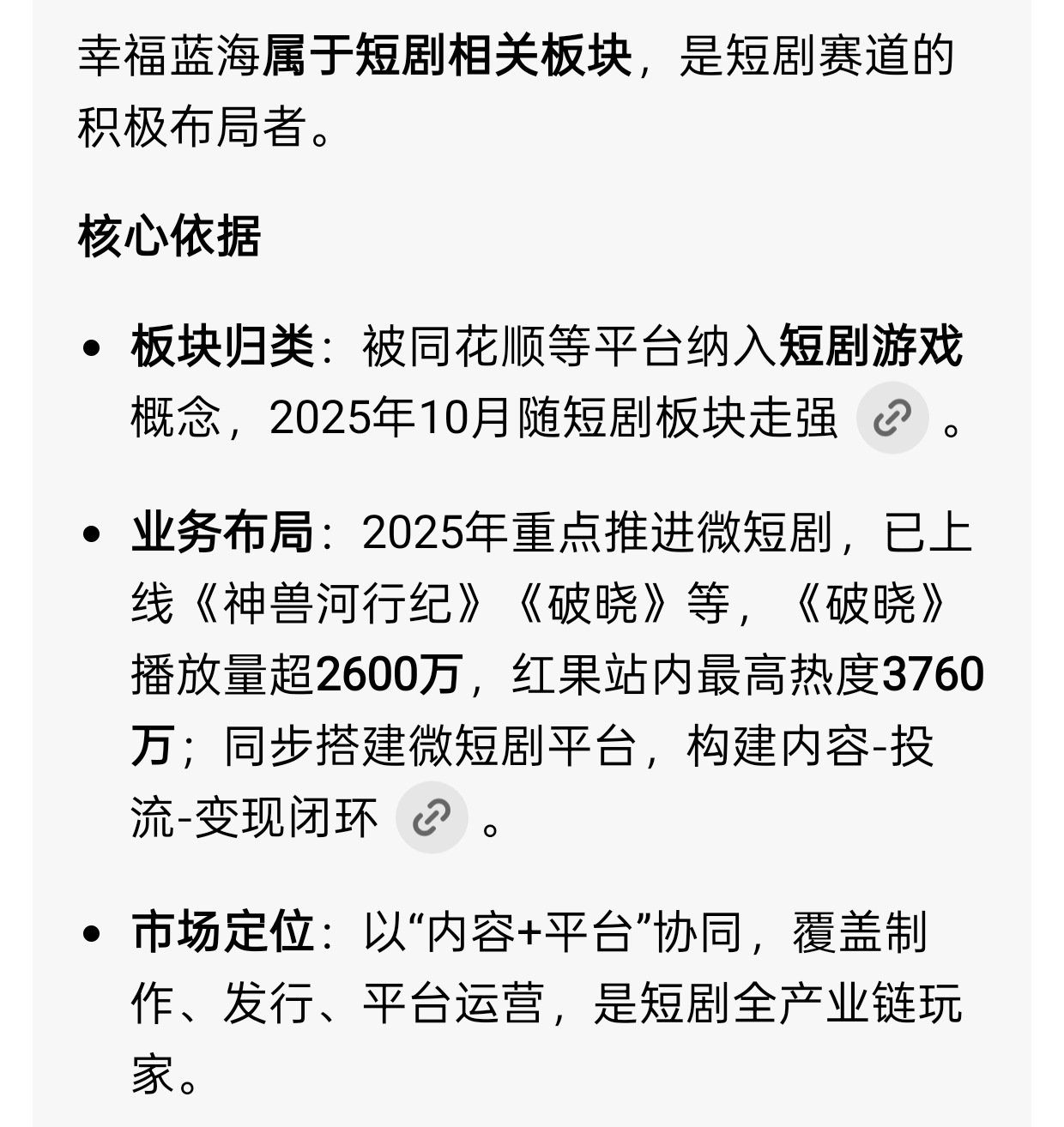 短剧题材利好,周一短剧板块因周末政策利好,大面积涨停,中文在线海看20cm一字。幸福蓝海的短剧已出数款精品,且持续投入,发展,同化顺要就接入相关板块!