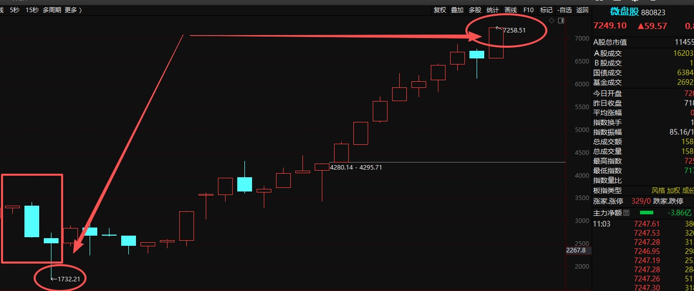看微盘股指数月线,1000点到7000点了,启动前那波调整仍然记忆犹新,一口气腰