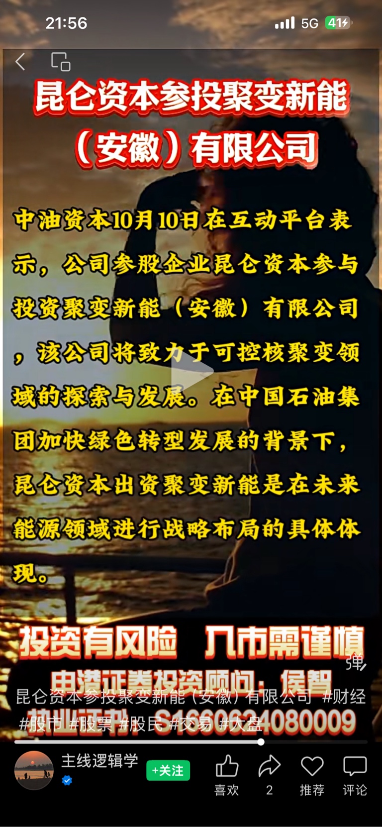 中油资本——持有安徽聚变等核心公司20%股份,可控核聚变战略投资!