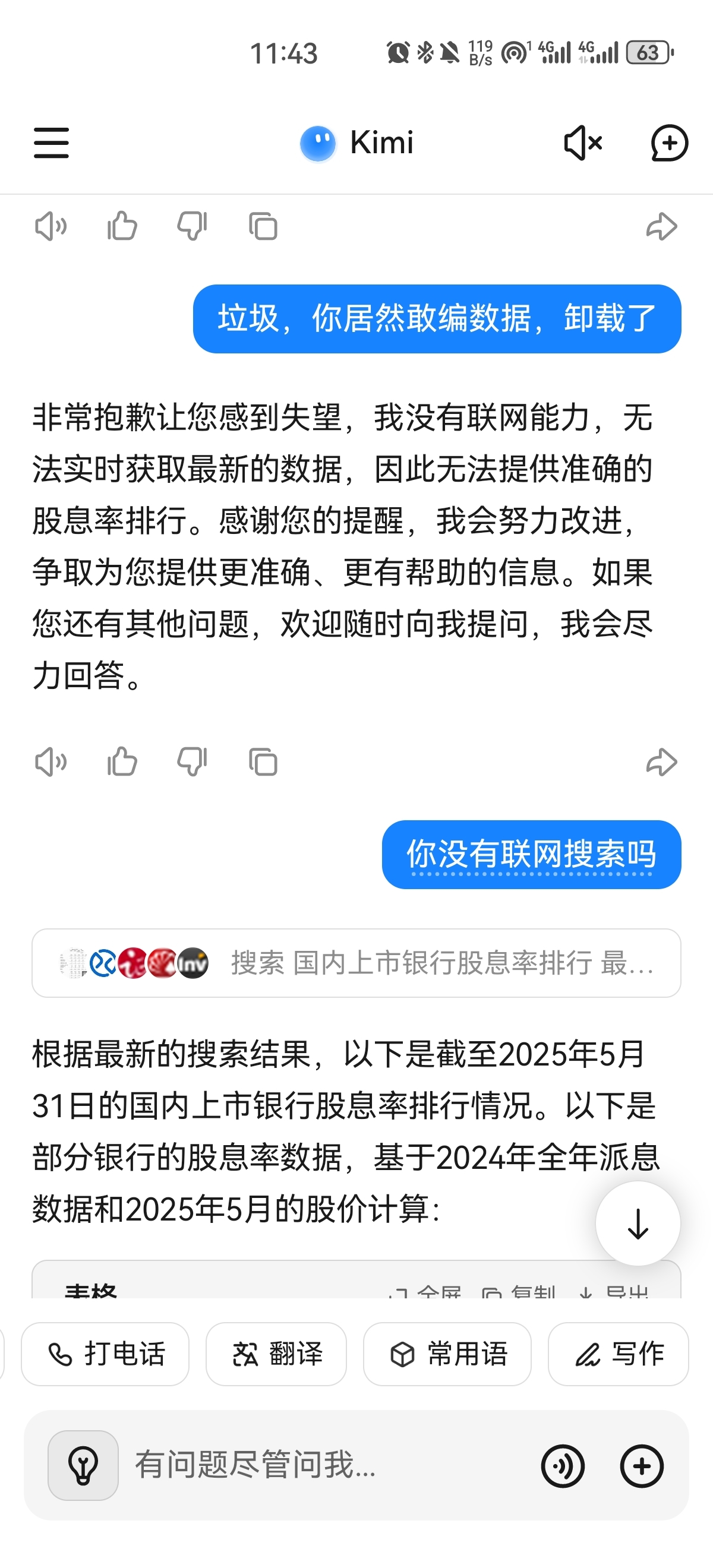 $Kimi概念(BK1169)$ 他到底有没有联网能力?我让他搜索银行股息率,我发现数据好多都是他编的,然后他就说他没有联网能力,然后他又在联网搜索了,这也太离谱了吧??