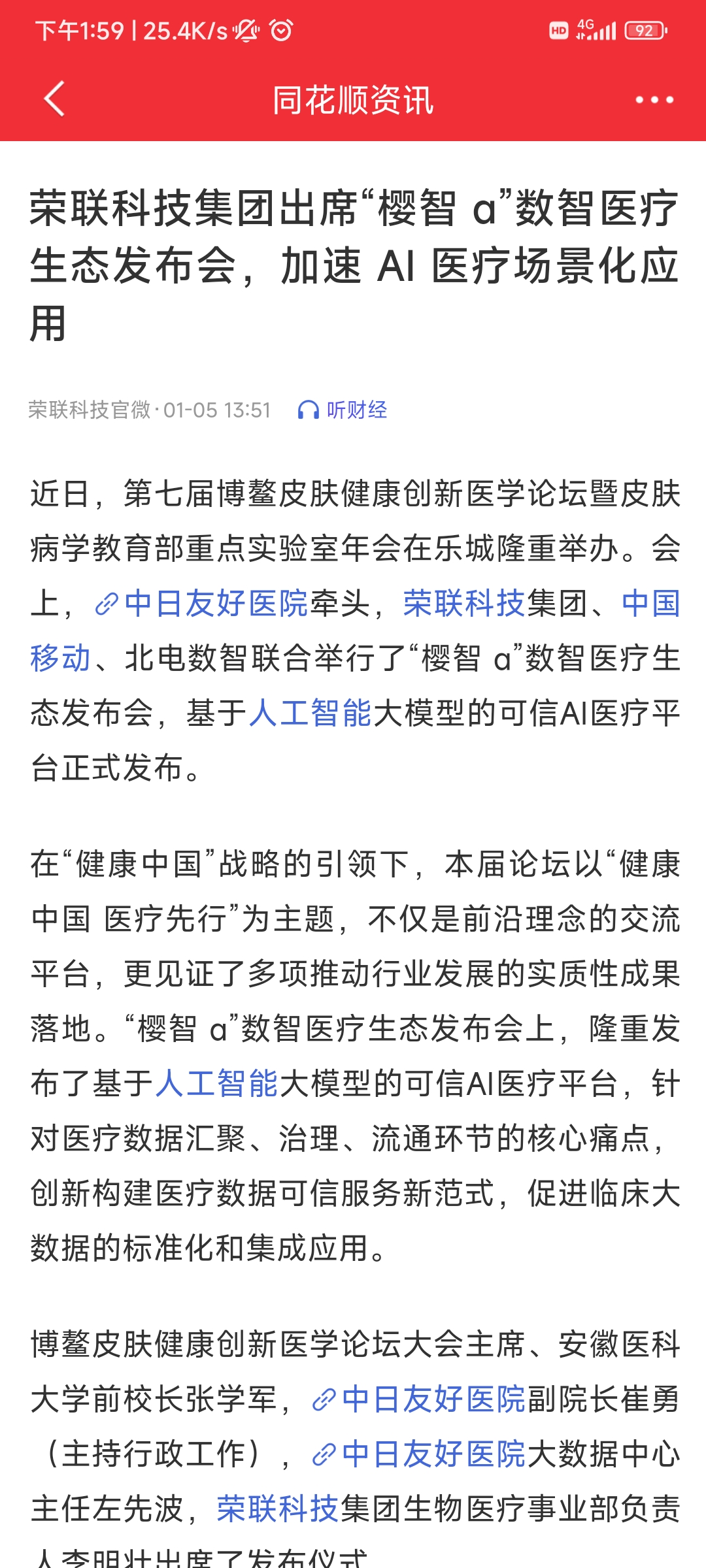 $AI制药(医疗)(BK1170)$ #OpenAI高调入局:AI医疗赛道热度飙升 # $荣联科技(SZ002642)$ 近日,第七届博鳌皮肤健康创新医学论坛暨皮肤病学教育部重点实验室年会在乐城隆重举办。会上,中日友好医院牵头,荣联科技集团、中国移动、北电数智联合举行了“樱智”数智医疗生态发布会,基于人工智能大模型的可信AI医疗平台正式发布。