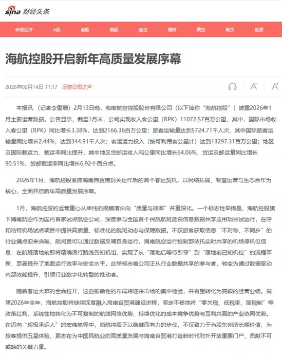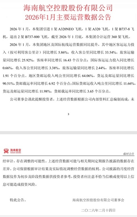 2月13日晚,海南航空控股股份有限公司(以下简称“海航控股”)披露2026年1月主要运营数据。