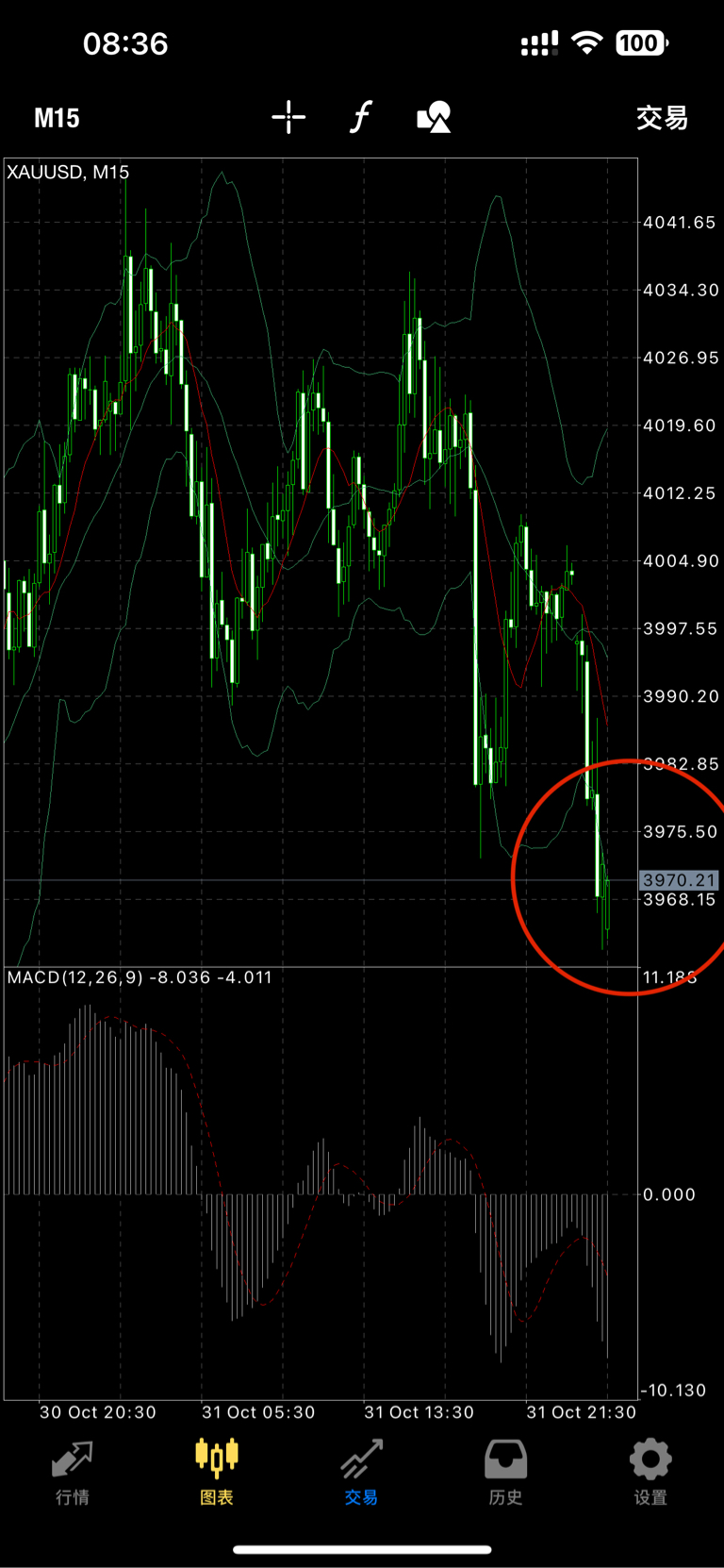 日内第1⃣笔进场,依托十五分钟布林带下轨支撑现价3965多单进场,目标看3980