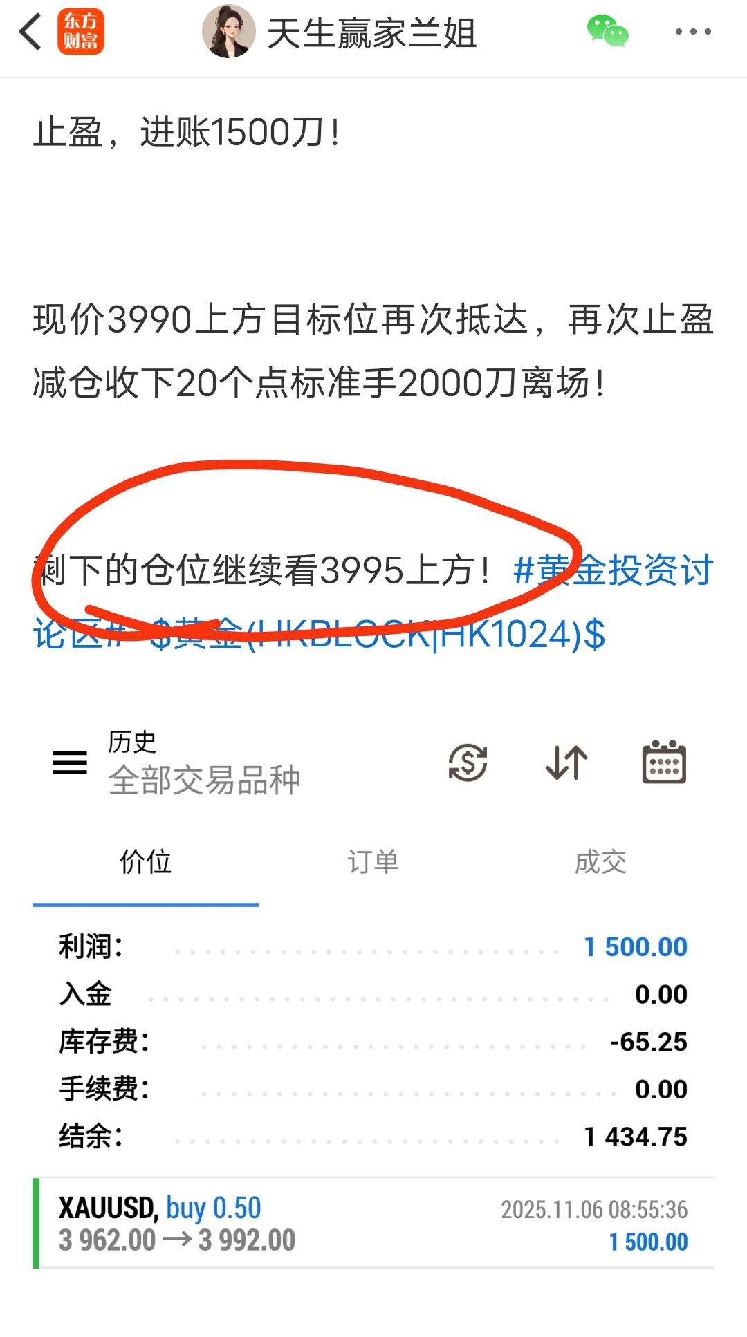 撤退了!进账7804$!周三多及早盘多现价4005上方短线目标位已实现,全部止盈