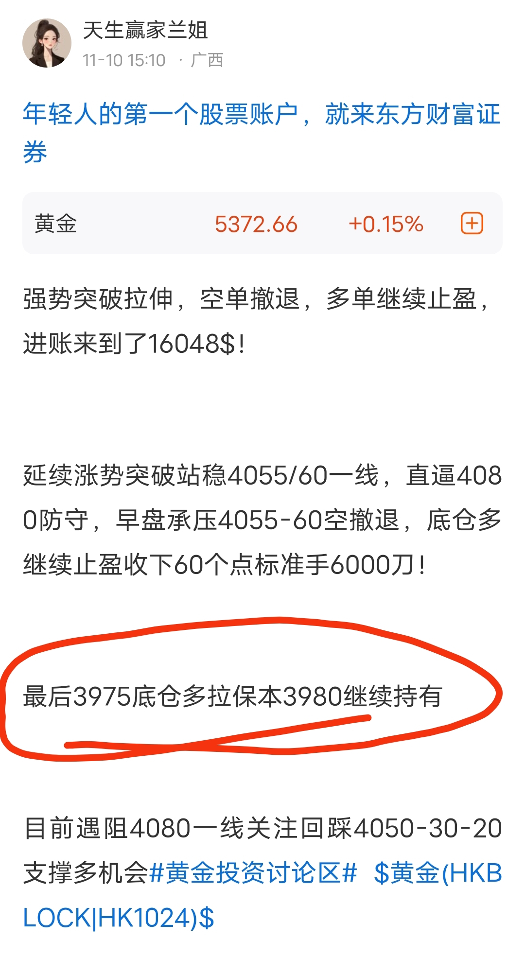 底仓3975多直接拉4000保护保持不动!
