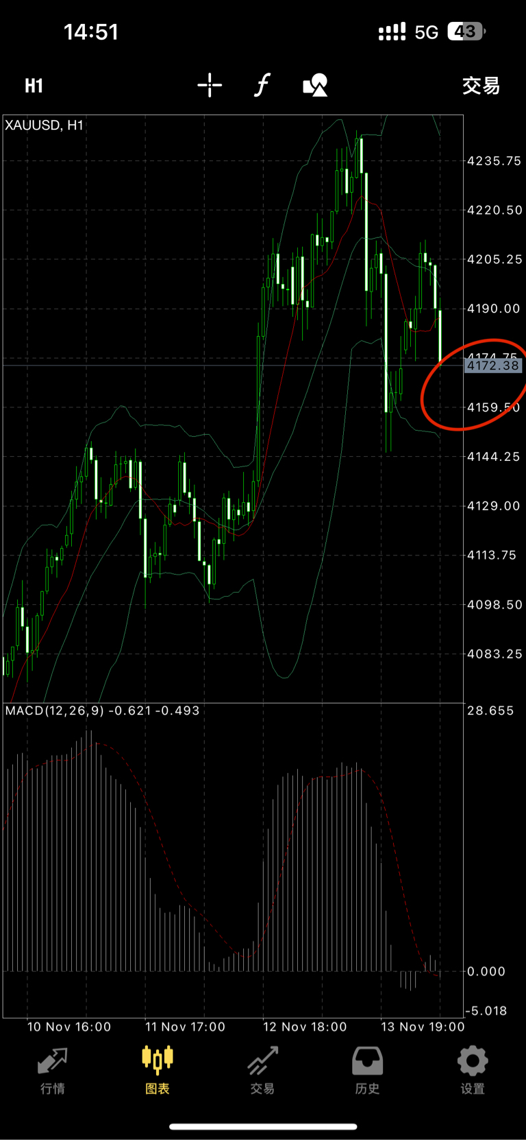 日内第3⃣笔进场,依托一小时布林带下轨支撑现价4173多进场,目标看4183上方