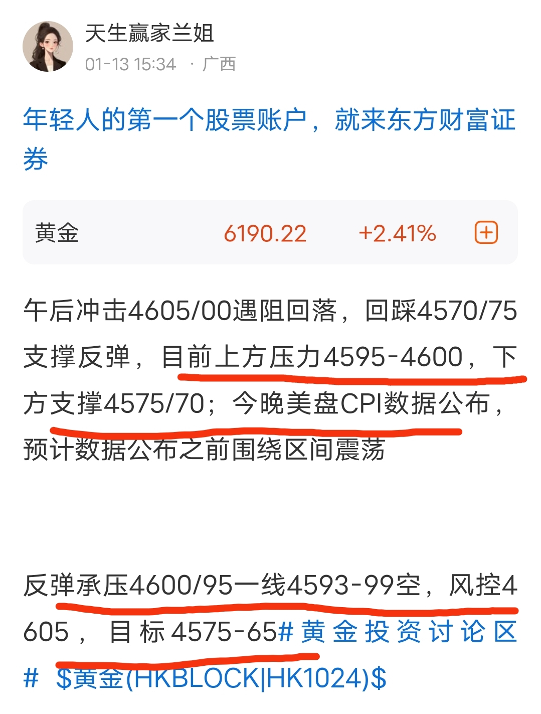 突破站稳4605上方将退守上行4625/30#黄金投资讨论区# $黄金(HKBLOCK|HK1024)$