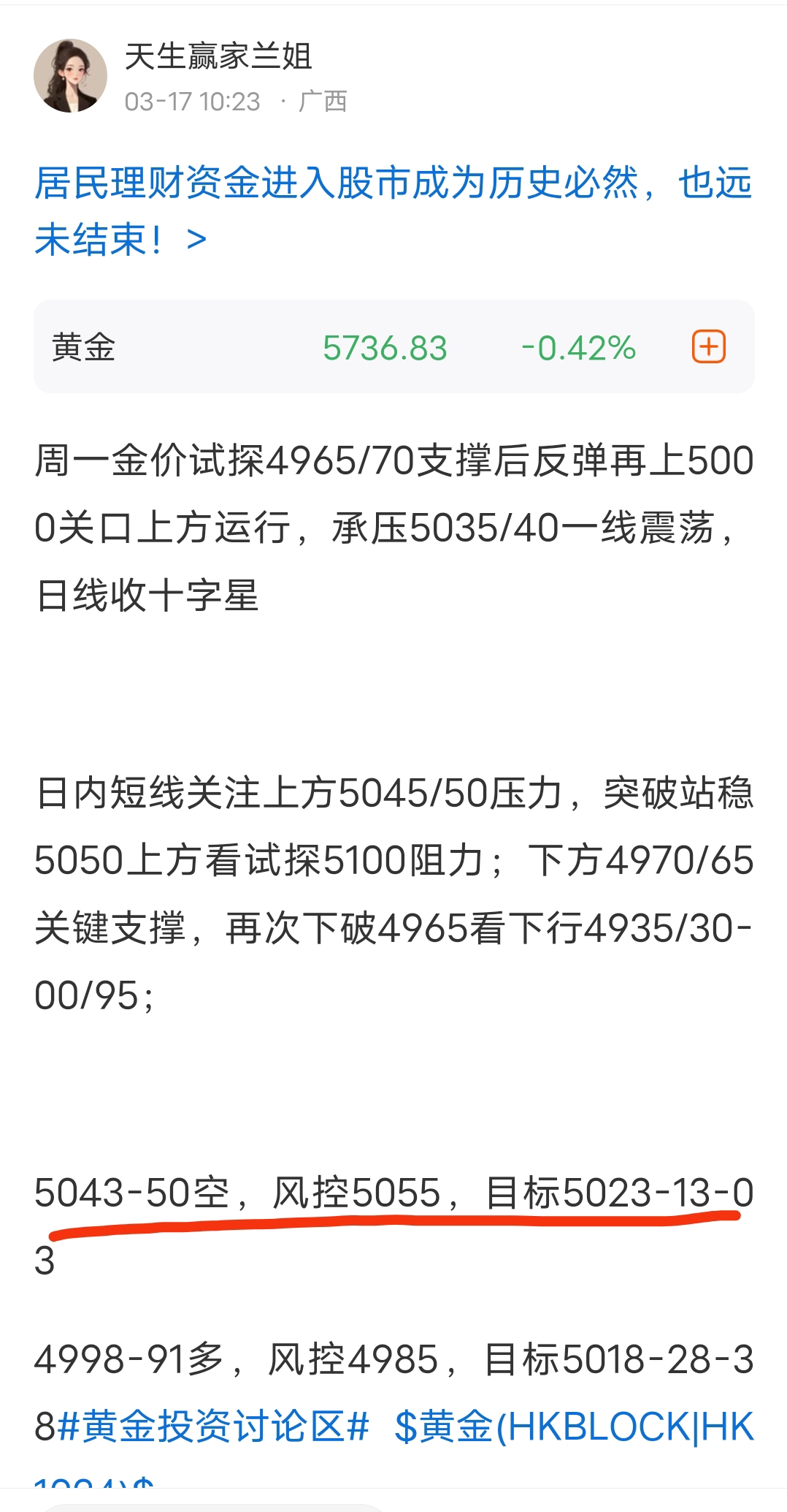 上方压力5045/50-75/80,下方支撑4990/85#黄金投资讨论区# $黄金(HKBLOCK|HK1024)$