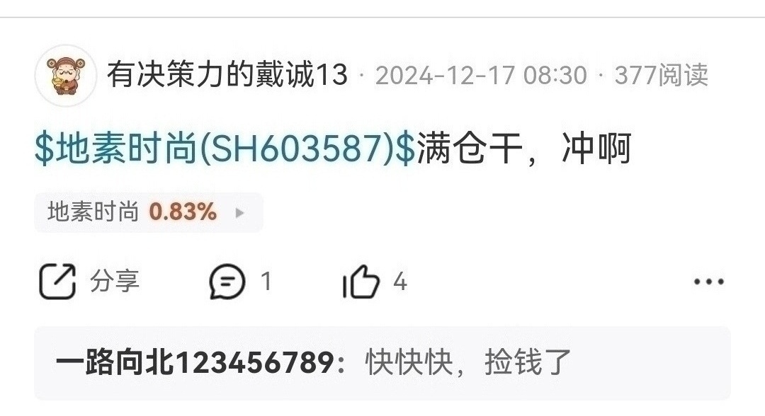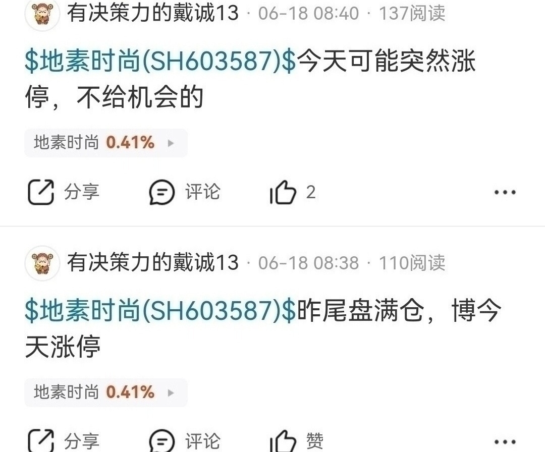 $纺织及服饰(HKBLOCK|HK62)$ $地素时尚(SH603587)$ 首发经济ip经济龙头,季线大底反转中长线至少十倍涨幅,放量突破年线回踩年线有效确认周线二次探底,周线主升补涨翻倍行情启动,北向资金去年十元清仓踏空,底部踏空后唱空没有意义,服装板块平均市盈率八十倍左右,周线主升补涨空间百分之六十以上