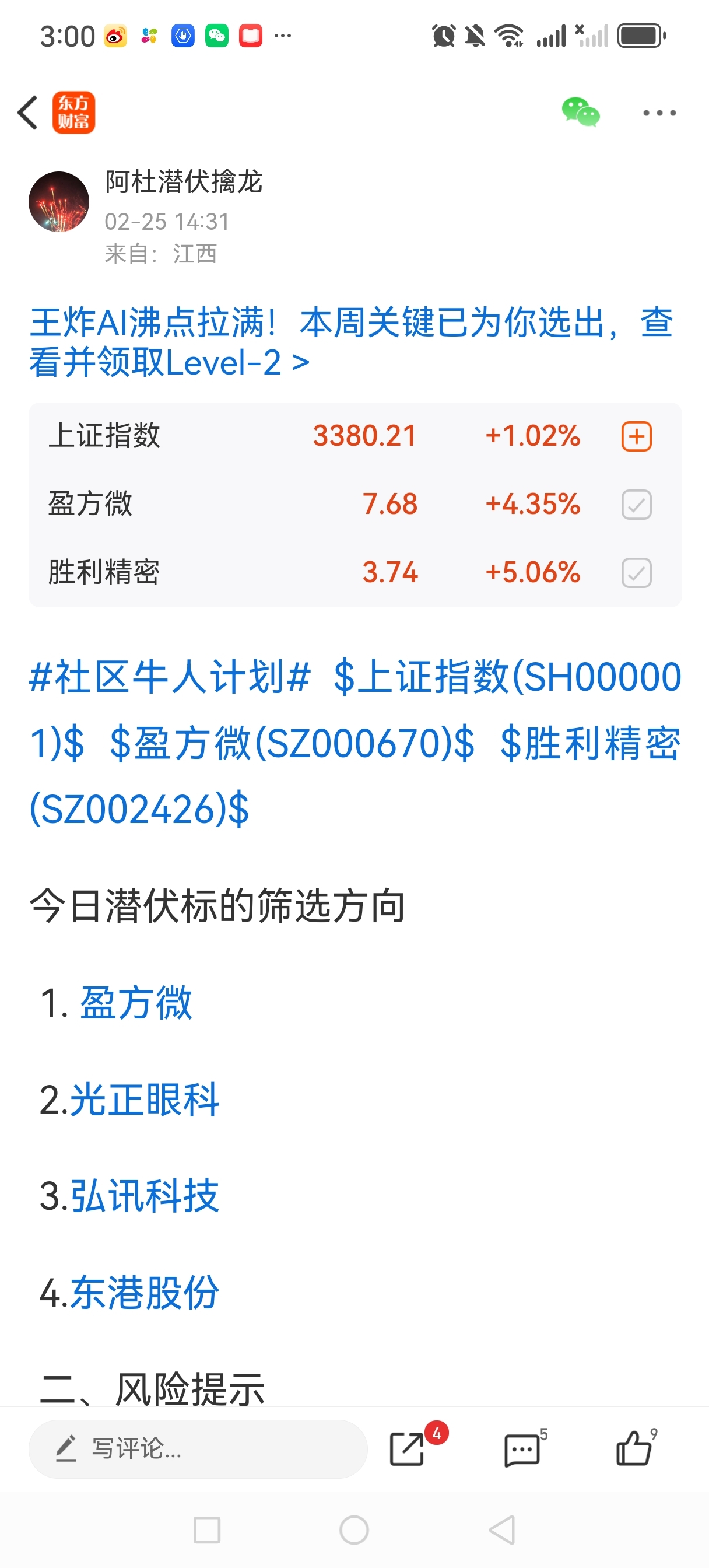 温馨提示: 1.根据《证券法》规定,禁止编造、传播虚假信息或者误导性信息,扰乱证券市场;2.用户在本社区发表的所有资料、言论等仅代表个人观点,与本网站立场无关,不对您构成任何投资建议。用户应基于自己的独立判断,自行决定证券投资并承担相应风险。《东方财富社区管理规定》