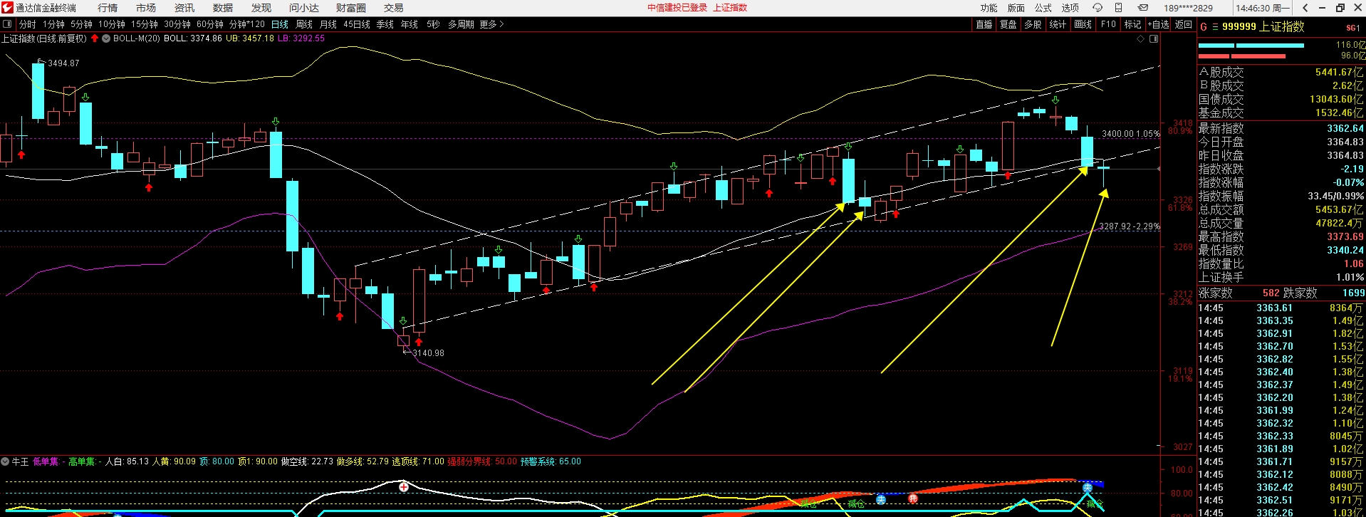 上个星期五大盘低开,开始我的预判是指数会去摸3375点,本来预判是3375点会拉起来,但是没有拉起来来,市场的走势低于我的预期,收盘指数是在3364多点,大盘既然星期五没有拉起来的走势,那么这个星期前三天依然是以小幅震荡向下为主,把上个星期五的走势看成是2月28号的k线就可以了,这个地方大概是5天的回调,现在已经回调了三天,指数下方的重要支撑位是3320点~3330点,也就是说上证指数,星期三之前可能会去摸一下3330点左右,回调空间非常有限,头调文章详解。