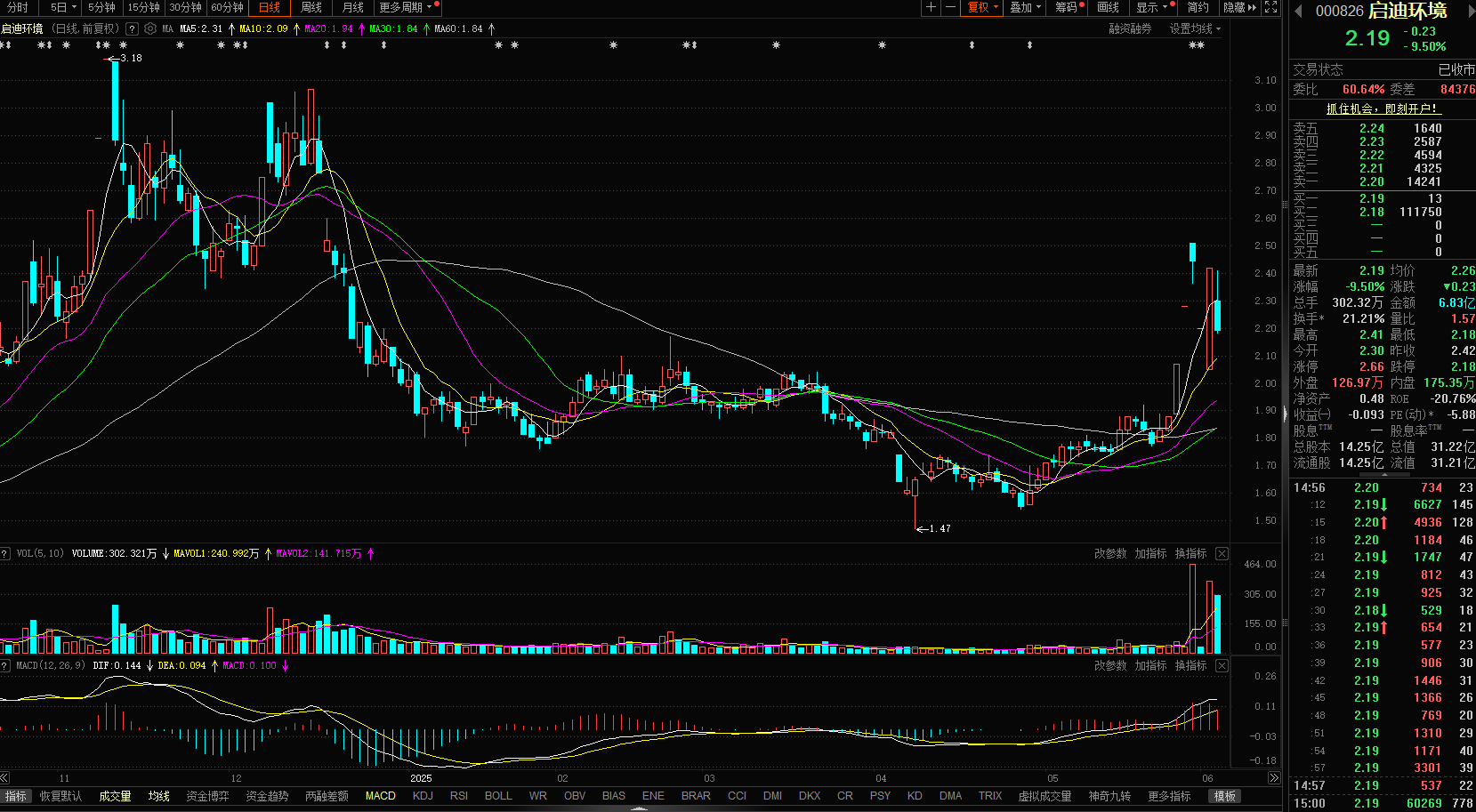 启迪环境:就跟早上说的一样,今天开盘直接低开,基本就不用考虑追击它了。早上的时候宇哥说的很明白,昨天地天板,非常强的进攻结构,但是想要保持住就要一鼓作气上去,否则空头反扑就直接下来了。所以只有高开才值得考虑,今天低开后也是没有超出宇哥的预期,最后回落,全天收跌9.5%。