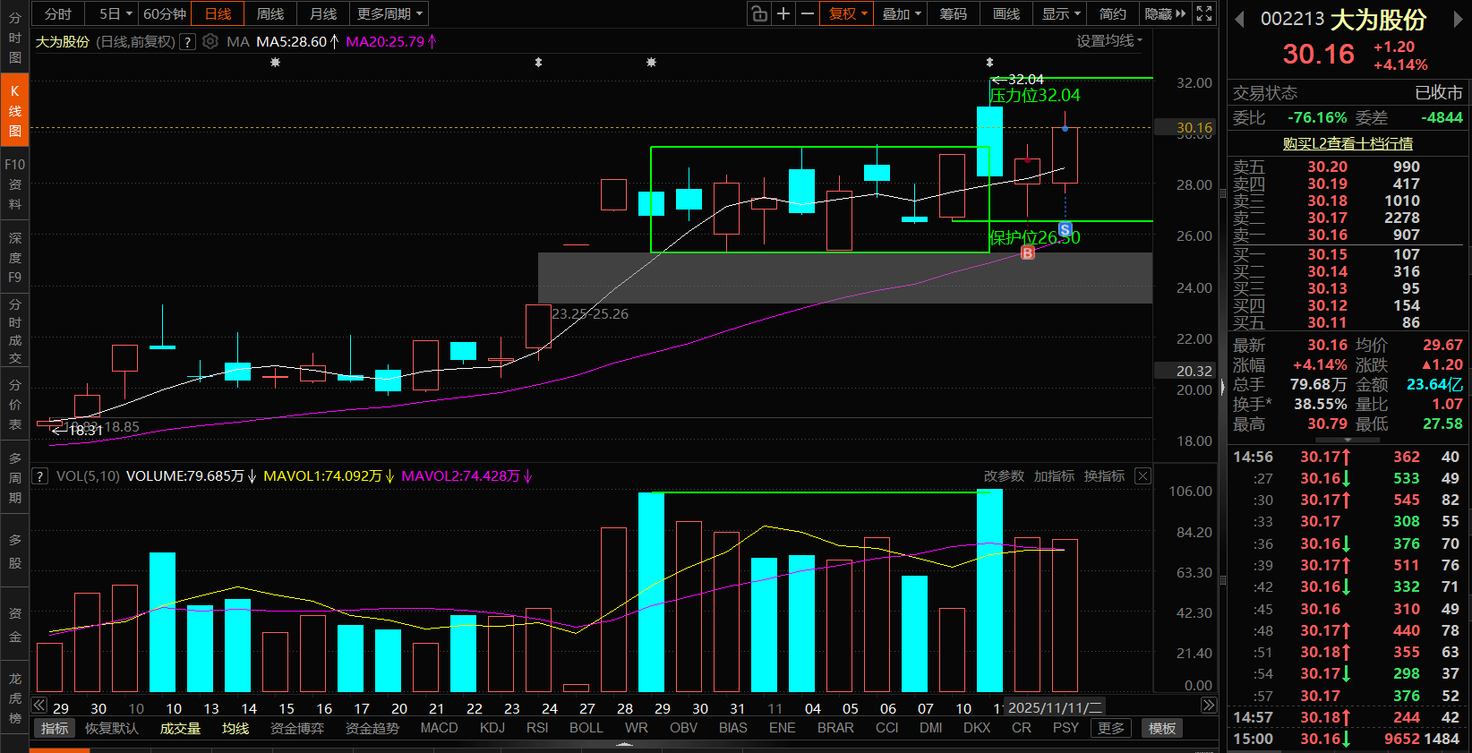 个股:前天突破,量能不够,昨天补量,量能足够。今天缩量企稳收阳,午后半导体异动,有吸筹迹象;