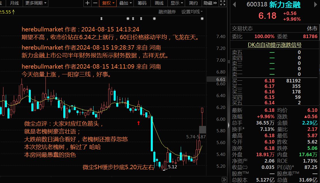 小槐树2024年9月新力金融5.18元自己吓唬自己,信誓旦旦新力金融必须跌至0.75元,由此在5.18元坑底出局(数量不祥,估计也不会多,深套本金合计也就三万元)!次日新力金融一路上涨不回头!咱2024年9月以5元左右价格初始推入,做完一波修复即刻清仓出局!炒股 唯有下杀取量,杀猪盘时 ,方可重仓!随后就是一路回笼资金!不在涉足!