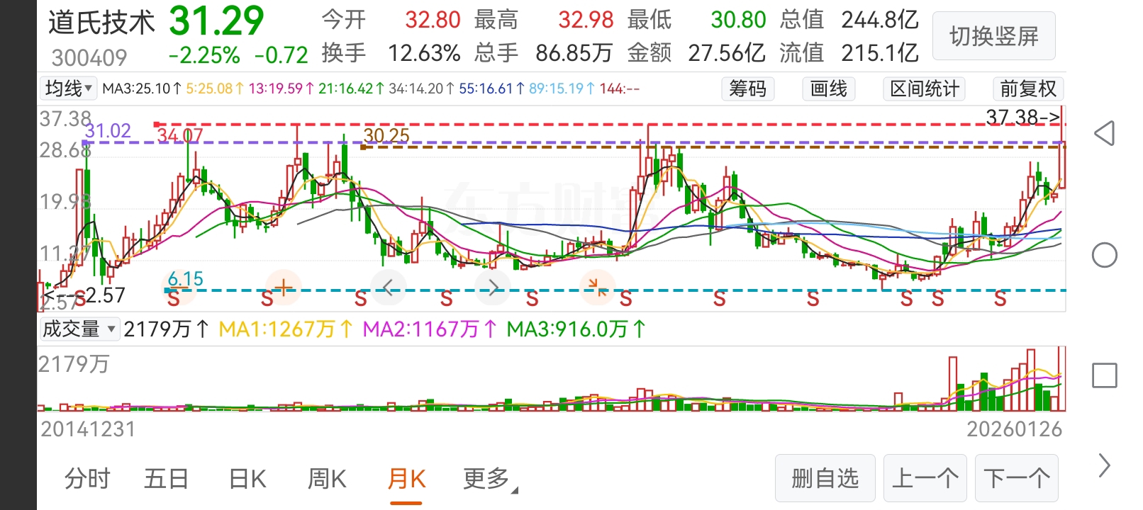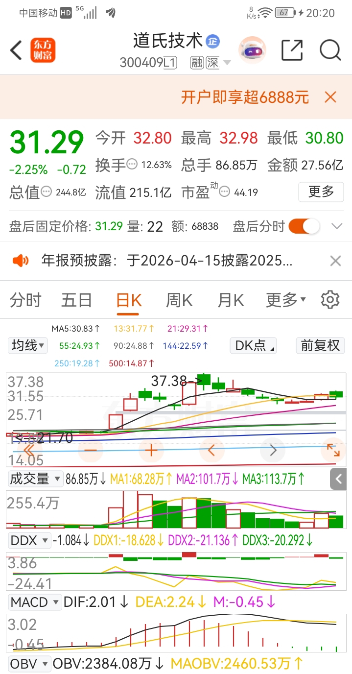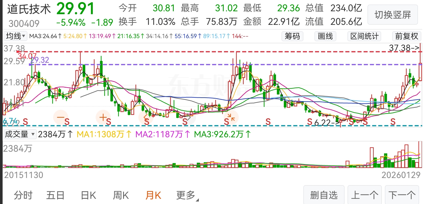 300409道氏技术:绩优二线成长股,太空AI-APU算力芯片+太空钠离子固态储能电池、Al4S+材料(石墨烯碳纳米管电极)、脑机接口、阴极铜+钴…道氏经过二个涨停板(又称双响炮)洗盘,第一次为试盘洗了3天,第二次光头涨停板可以确定为拉高建仓,后续5天则为打压恐慌盘控盘/控筹,6∽8天连续3连阳是明显吸筹完毕蓄势过程,K线形态表现在股价阶梯式缩量不破第二个涨停板下轨(下影线29.21、实体阳下轨29.61)就是确切无误的洗盘/控盘行为。目前股价运行在20/21均线(生命线)之上,周五5日线走平,今天(周一)5日线已转向向上,明天(周二)5日均线就会金叉10/13均线形成技术形态开天眼.[开天眼' :股价运行在20/21均线之上,5日均线上穿10/13均线(似眼睛)的K线形态称开天眼],周三~周五会借太空算力题材叠加有色铜/小金属持继发酵,迎来一根长阳或涨停板突破形成221典型主力冼盘形态。按道氏月K(三底)W形态技术量度升幅62∽65是第一目标价…可重点关注择机介入。个人观点仅供参考