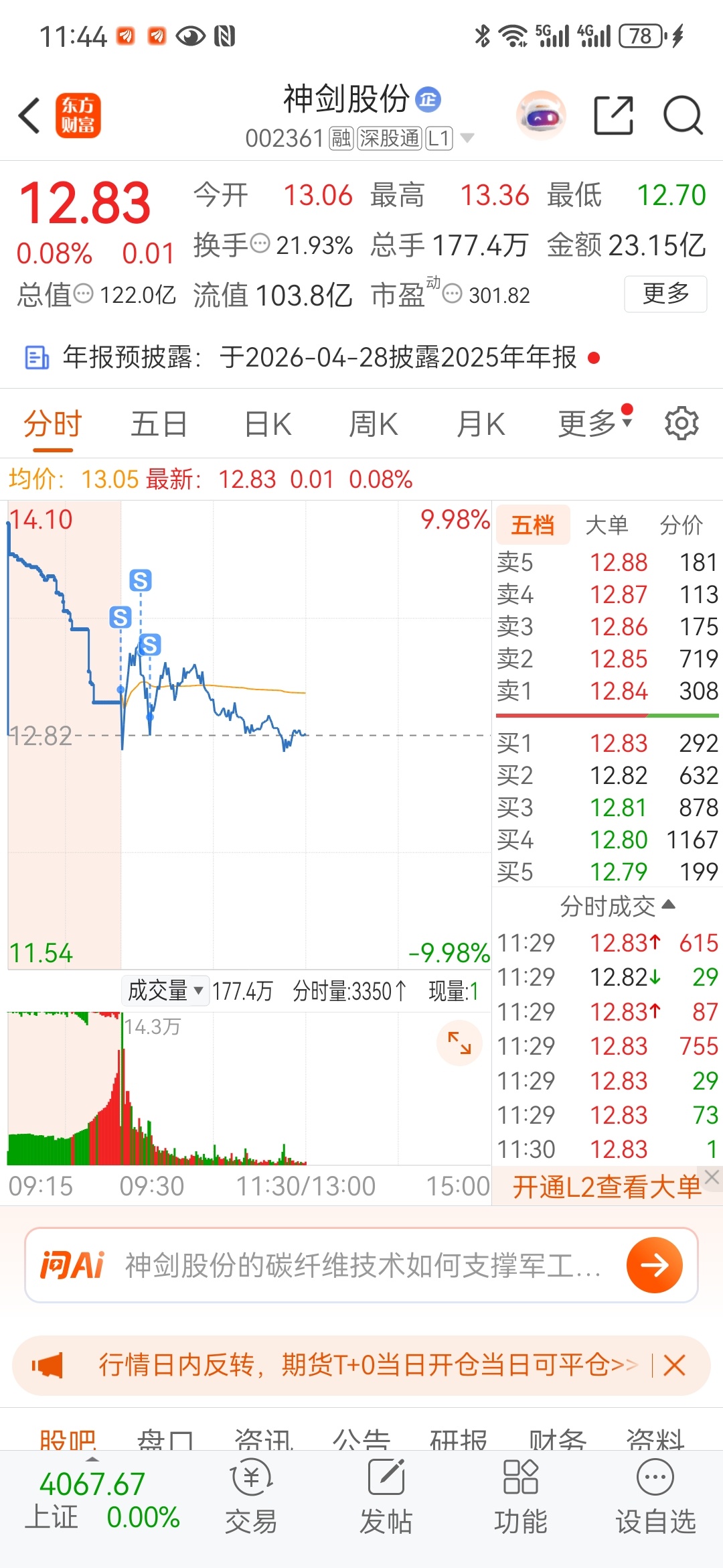 昨天早盘冲高出了一半神剑股份,尾盘竞价前一分钟全仓接回。今天冲高减了半仓,目前20个点利润垫。从筹码结构来判断,明天连板的可能性不大,大概率还得再洗洗,走势震荡上行,板块情绪好的话,有一定几率封涨停板。策略是跟随主力滚动操作,谨慎做T。