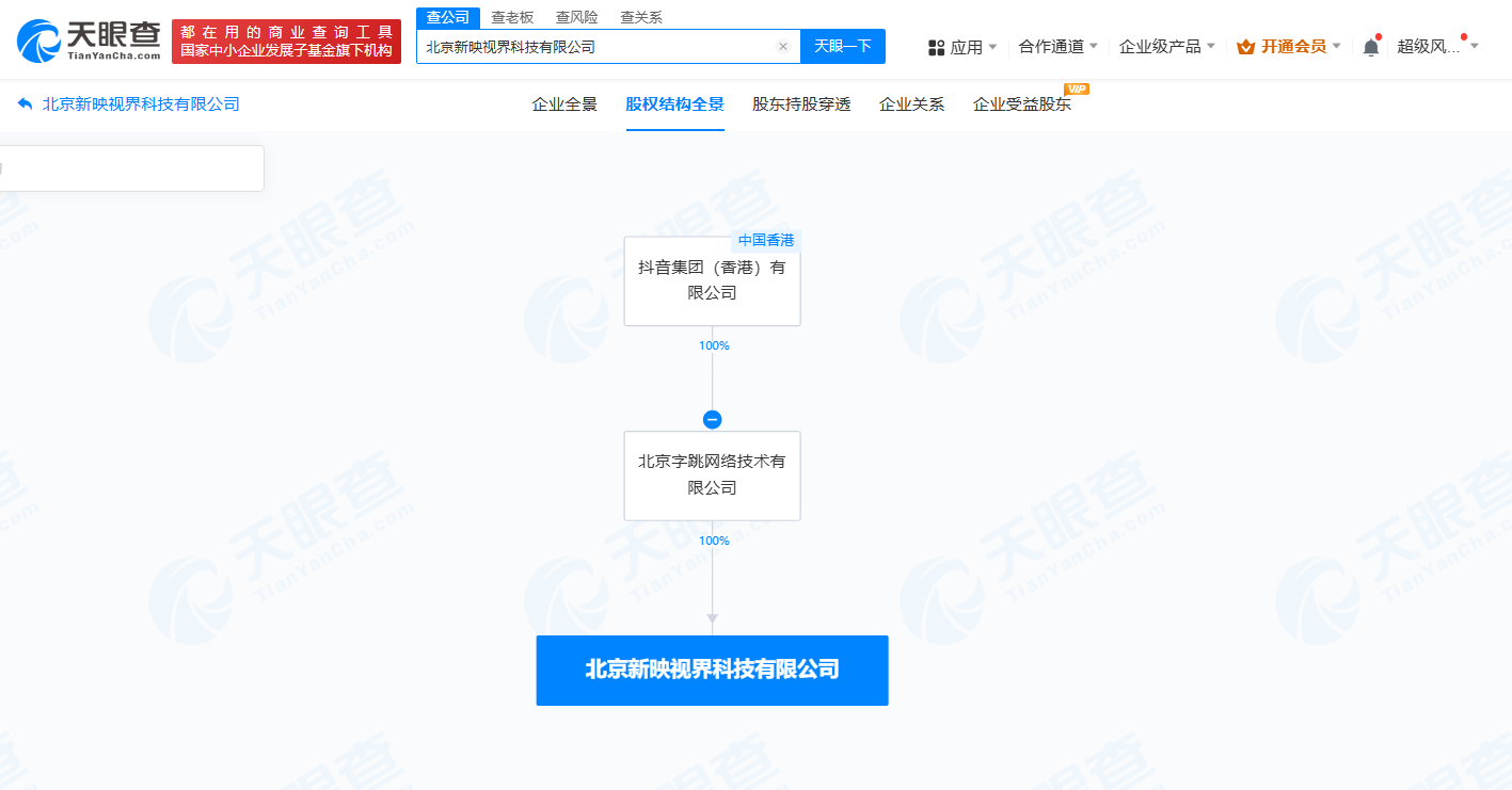 每经AI快讯,天眼查App显示,近日,北京新映视界科技有限公司成立,法定代表人为李亚琪,注册资本100万元人民币,经营范围包括软件开发、企业管理咨询、企业形象策划、广告制作、广告发布等。股权全景穿透图显示,该公司由北京字跳网络技术有限公司全资持股,后者为抖音集团(香港)有限公司全资子公司。