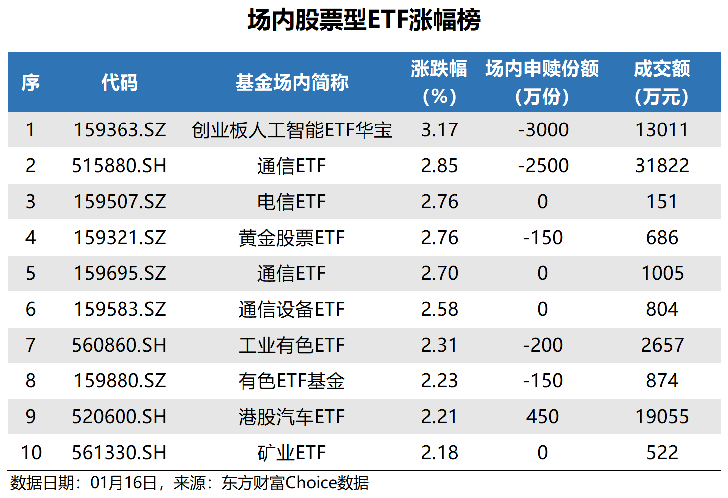 数据显示,昨日场内股票型ETF中,创业板人工智能ETF华宝、通信ETF、电信ETF涨幅居前。其中,创业板人工智能ETF华宝涨幅最大,为3.17%。