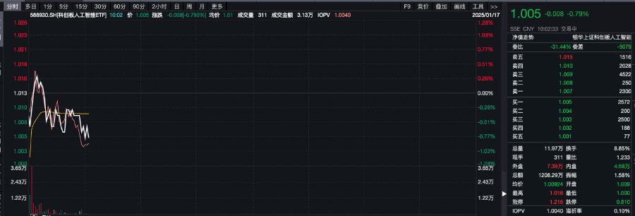 相关ETF方面,科创板人工智能ETF(588930)截至发稿跌0.79%,成交额超1200万元,换手率8.85%,盘中交投活跃,溢折率0.10%,盘中频现溢价交易。