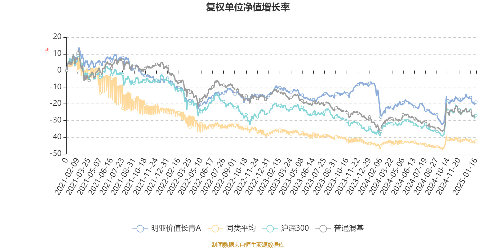 截至1月16日,明亚价值长青A近三个月复权单位净值增长率为0.74%,位于同类可比基金9/26;近半年复权单位净值增长率为4.38%,位于同类可比基金15/26;近一年复权单位净值增长率为-11.81%,位于同类可比基金24/25;近三年复权单位净值增长率为-12.82%,位于同类可比基金11/17。