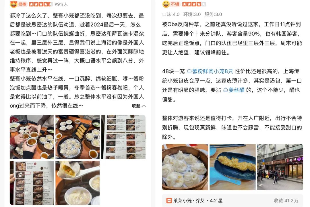 韩国游客的打卡热更是让不少国内食客“反向种草”,在大众点评莱莱小笼“必吃榜”门店的评价区,有用户写道:“来体验一下上海的含韩量,感觉身处国外,各国语言都有。吃了这么多小笼确实一直没来过莱莱,跟着韩国友人来打卡,味道确实不错。”