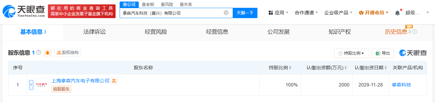 南方财经1月17日电,天眼查App显示,近日,拿森汽车科技(嘉兴)有限公司成立,法定代表人为陶喆,注册资本2000万人民币,经营范围包括汽车零部件研发、汽车零部件及配件制造、汽车零配件批发、汽车零配件零售、人工智能应用软件开发、人工智能行业应用系统集成服务等,由上海拿森汽车电子有限公司全资持股。