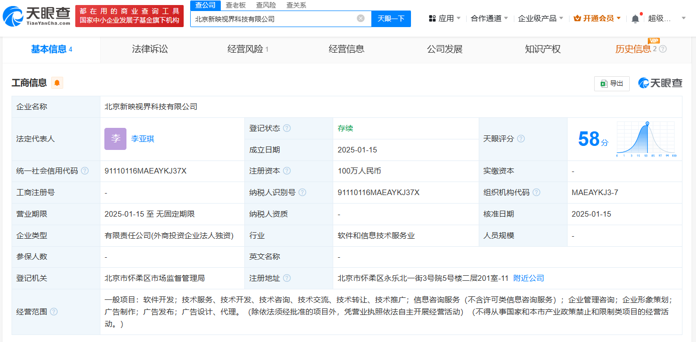 抖音在北京成立新映视界科技公司
