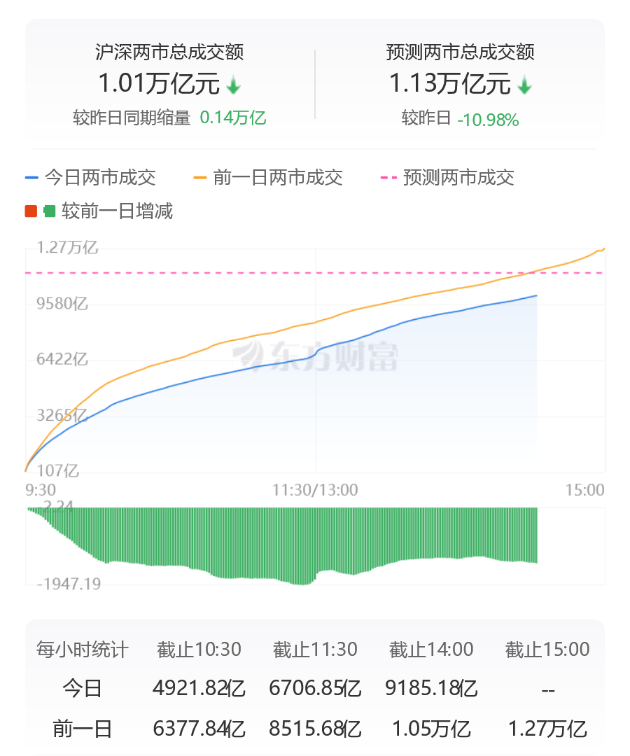沪深两市成交额突破1万亿 较昨日此时缩量近1400亿