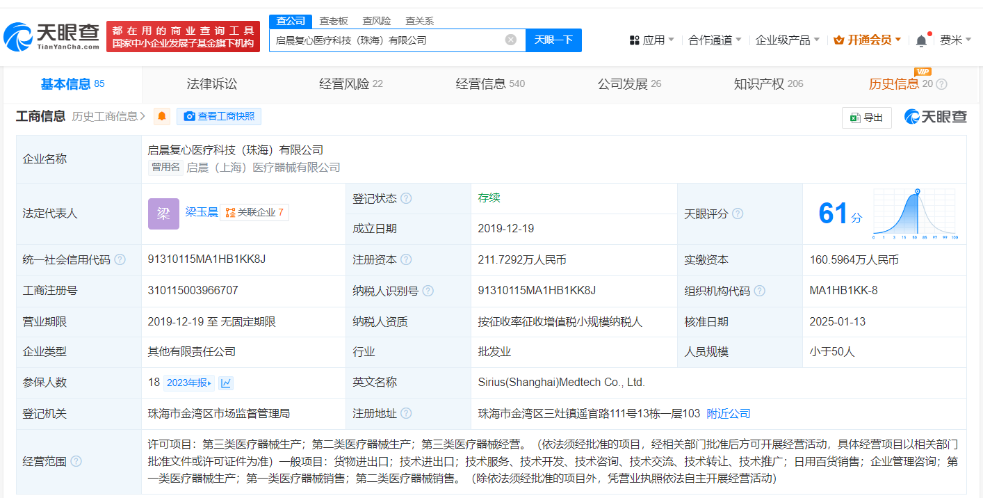 南方财经1月17日电,天眼查App显示,近日,启晨复心医疗科技(珠海)有限公司发生工商变更,新增格力集团旗下珠海基金三期创业投资合伙企业(有限合伙)为股东,注册资本由约197.6万人民币增至约211.7万人民币,同时,多位主要人员也发生变更。启晨复心医疗科技(珠海)有限公司成立于2019年12月,法定代表人为梁玉晨,经营范围含第三类医疗器械生产、第二类医疗器械生产、第三类医疗器械经营、货物进出口、技术进出口、日用百货销售等,现由梁玉晨、宁波梅山保税港区汇莘投资管理合伙企业(有限合伙)等及上述新增股东共同持股。公开资料显示,启晨医疗是一家专注于心衰及肺部介入医疗器械领域的集研发、生产和销售为一体的高新技术企业。