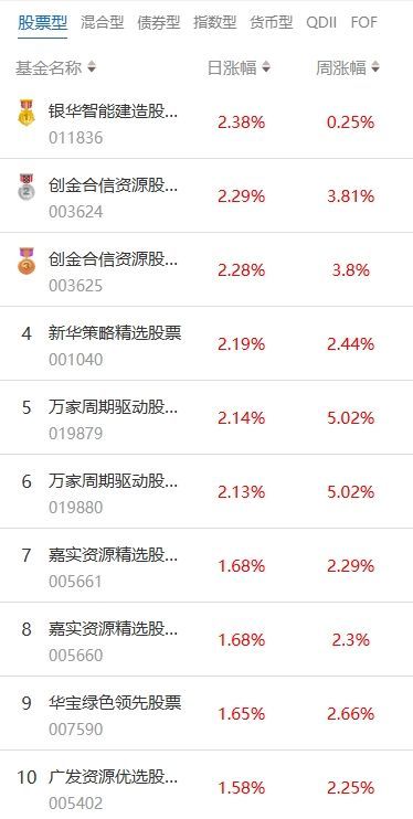 南方财经1月17日电,根据南财基金通数据:2025年01月16日当日收益靠前的股票型基金包括:银华智能建造股票型发起式证券投资基金(011836,日收益2.38%);创金合信资源主题精选股票型发起式证券投资基金(003625,日收益2.28%);新华策略精选股票型证券投资基金(001040,日收益2.19%)等。收益较低的股票型基金包括:富国新兴产业股票型证券投资基金(001048,日收益-2.98%);创金合信芯片产业股票型发起式证券投资基金(013339,日收益-2.51%);摩根智慧互联股票型证券投资基金(016919,日收益-2.44%)等。