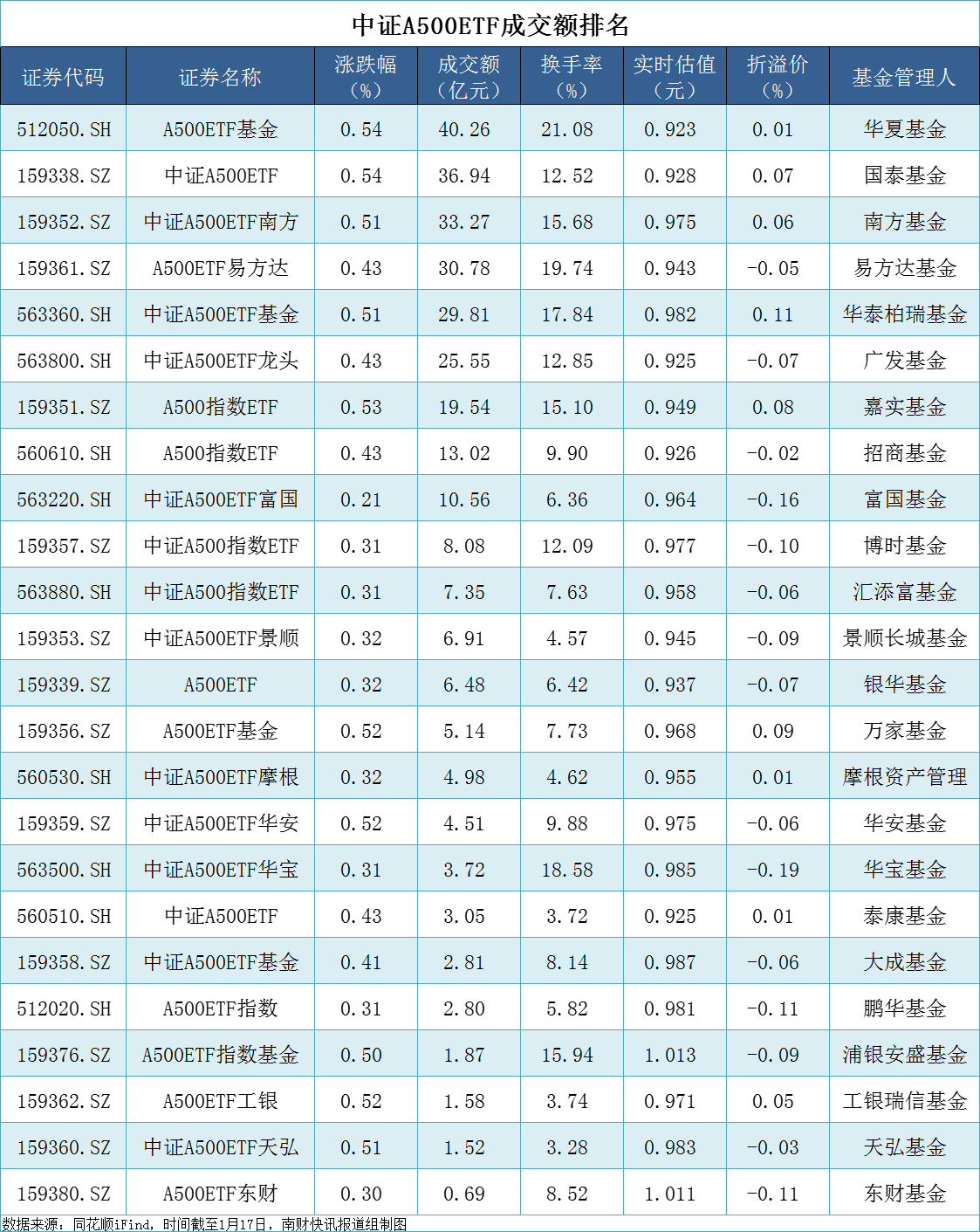 换手率方面,华夏A500ETF基金位居第一,达到21.08%。