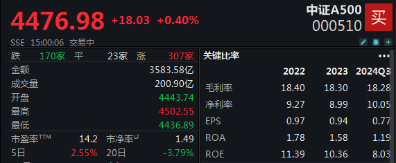 中证A500指数(000510.SH)收涨0.40%,报4476.98点。成分股中,有307家上涨,其中有14家涨超5%。