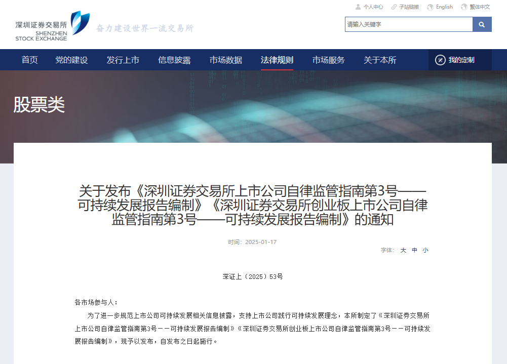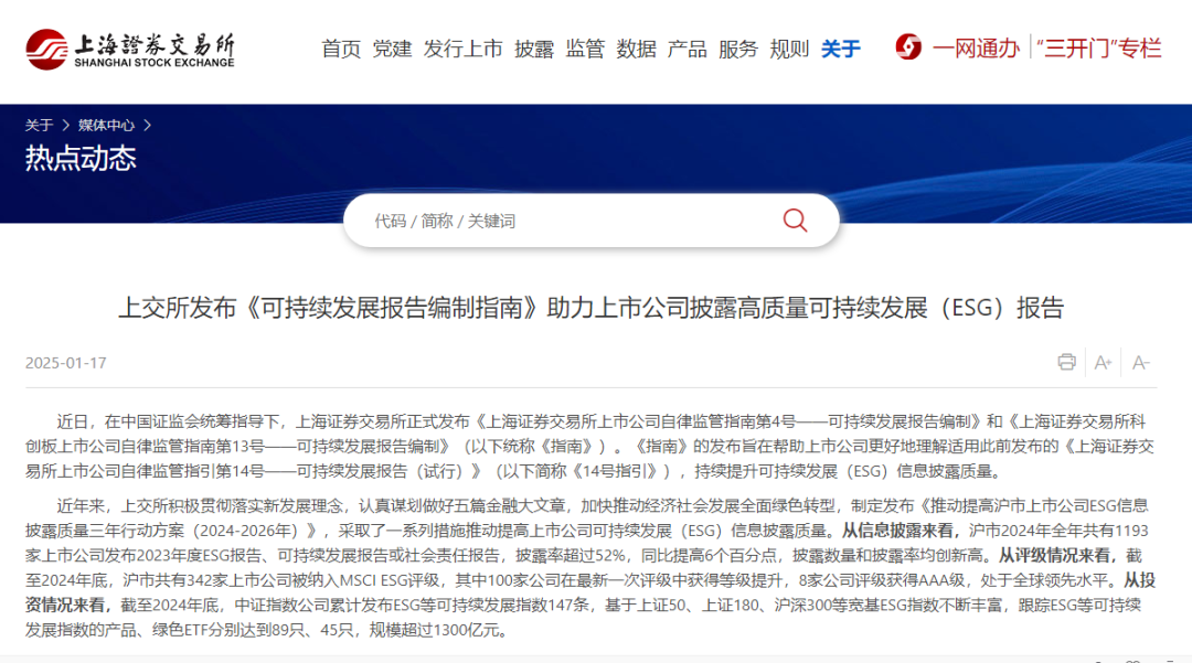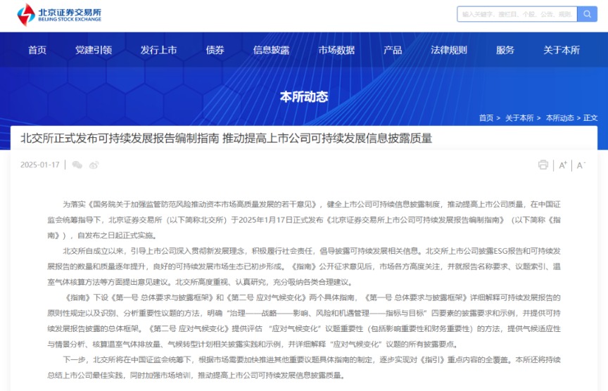 为贯彻落实党的二十届三中全会、中央金融工作会议精神和新“国九条”部署,健全上市公司可持续信息披露制度,1月17日,在中国证监会指导下,沪深北交易所正式发布《指南》。