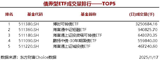 南方财经1月17日电,据东方财富Choice数据统计,今日共6只股票型ETF成交量超3000万手,华夏中证A500ETF成交4371.19万手,债券型ETF成交量最大的是博时可转债ETF(325.07万手),商品型ETF成交量最大的是华夏饲料豆粕期货ETF(259.62万手)。