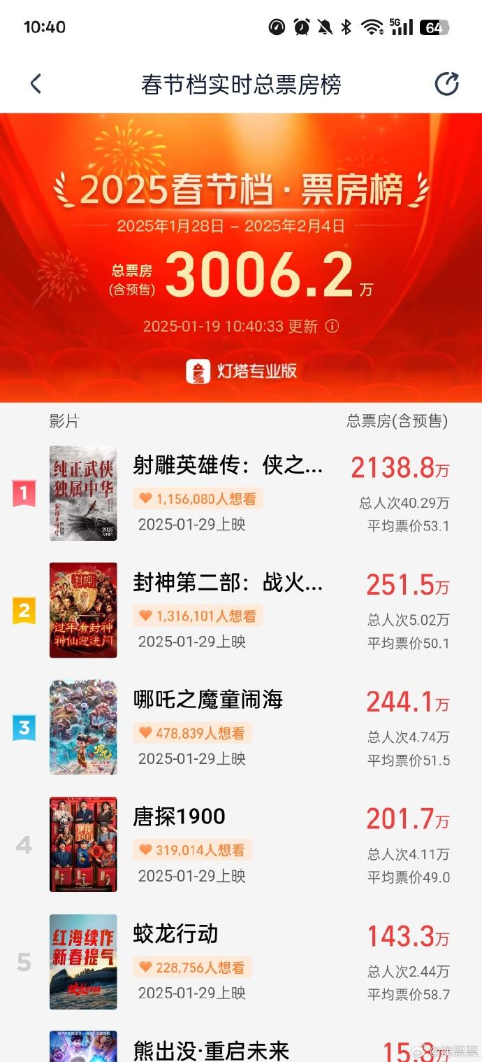 其中,《射雕英雄传:侠之大者》预售票房遥遥领先。开售45分钟突破1000万元,打破了《唐人街探案3》的纪录(破千万票房用时46分46秒),亦远超今年春节档预售第二名《封神第二部:战火西岐》,目前预售票房已经突破2000万元。截至1月19日10:40,春节档预售总票房为3006.2万元,预售票房排名分别为《射雕英雄传:侠之大者》《封神第二部:战火西岐》《哪吒之魔童闹海》《唐探1900》《蛟龙行动》《熊出没:重启未来》。