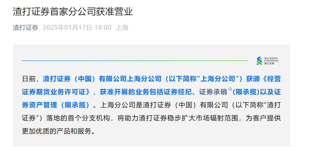 近日,渣打证券(中国)有限公司上海分公司获颁《经营证券期货业务许可证》,获准开展的业务包括证券经纪、证券承销(限承揽)以及证券资产管理(限承揽)。渣打证券上海分公司是2025年以来首家外资券商在华获准营业的分支机构。