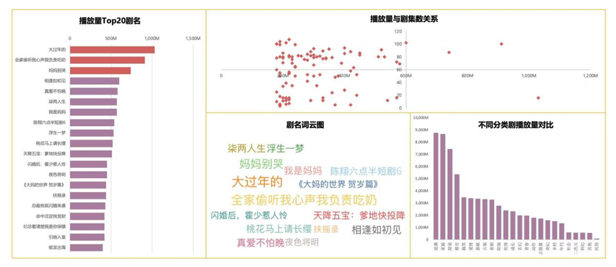 从剧名数据进行分析可以发现,2025新春档短剧中“妈妈”“全家”“过年”分别占据剧名词频前三,看来即使在短剧宇宙中,合家欢聚也无疑是新年的主旋律。从总播放量来看,短剧《大过年的》播放量一骑当先率先突破十亿并还呈现出持续增长的趋势,除此以外,播放量前20的短剧数据集中在5亿次上下。