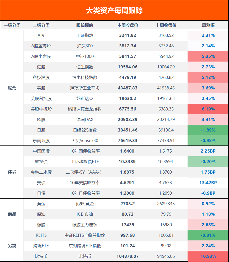 由于美国12月通胀放缓,降息预期再次升温,本周美股大涨,道琼斯指数上涨3.69%,纳斯达克指数上涨2.45%。此外,德国DAX指数创历史新高;黄金、原油收涨;比特币大涨超10%,逼近历史新高。