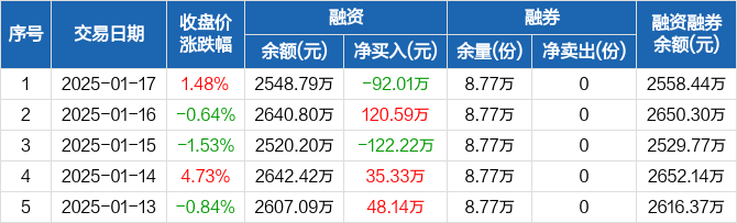 电子ETF:融资净偿还92.01万元,融资余额2548.79万元(01-17)