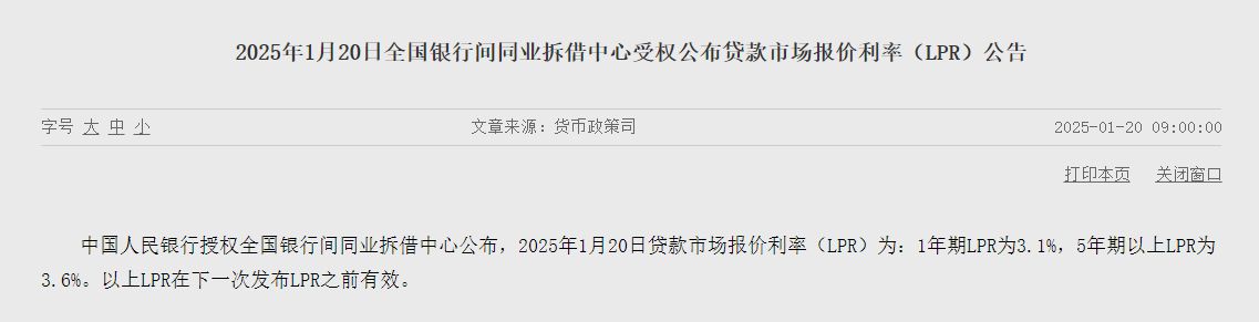 中国人民银行授权全国银行间同业拆借中心公布,2025年1月20日贷款市场报价利率(LPR)为:1年期LPR为3.1%,5年期以上LPR为3.6%。以上LPR在下一次发布LPR之前有效。