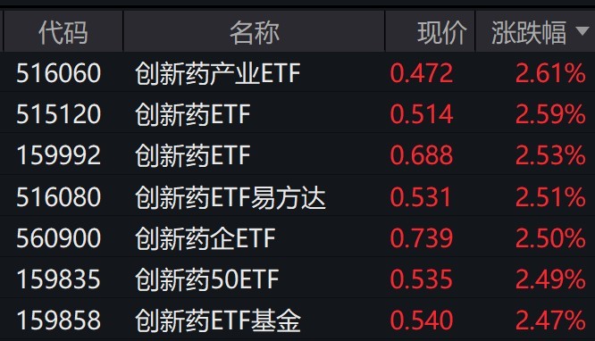 受重仓股上涨影响,跟踪中证创新药产业指数的创新药相关ETF涨逾2%。
