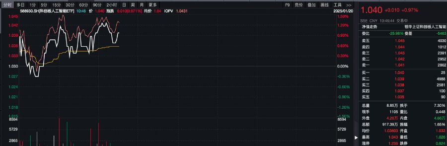 相关ETF方面,科创板人工智能ETF(588930)截至发稿涨0.97%,成交额超9100万元,换手率7.30%,盘中交投活跃。