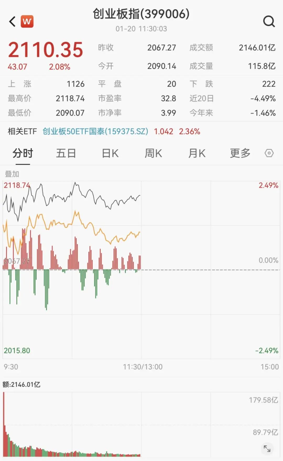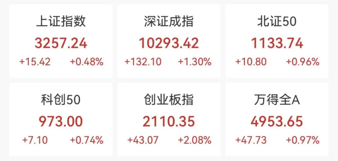 1月20日,A股三大指数集体高开,创业板指领涨,截至午间收盘,沪指涨0.48%,深成指涨1.3%,创业板指涨2.08%。
