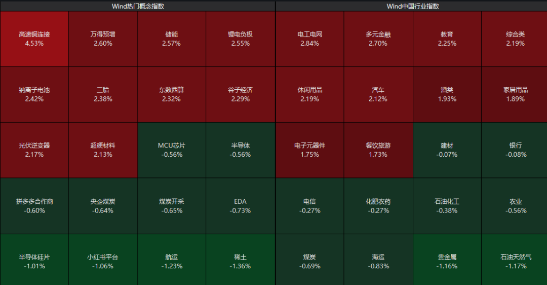板块上来看,高速铜连接概念股开盘大涨,储能板块震荡拉升,电力设备、教育、汽车等板块涨幅居前;而小红书概念股退潮,贵金属、天然气、煤炭等板块跌幅居前。