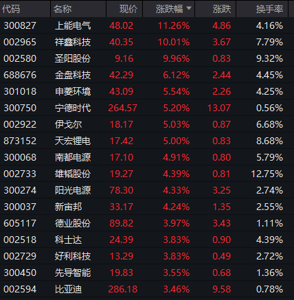 此外,储能板块震荡拉升,上能电气涨幅居前,祥鑫科技、圣阳股份涨停,宁德时代大涨超5%。