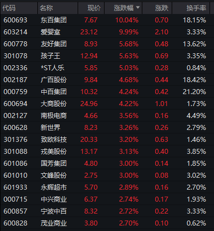 大消费板块集体活跃,零售股强势上涨,爱婴室、东百集团涨停,孩子王、友好集团、广百集团等跟涨。