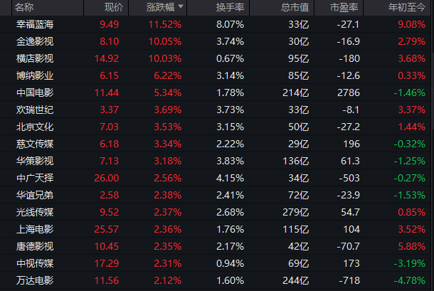 影视概念股持续走高,幸福蓝海涨超10%,金逸影视、横店影视涨停。