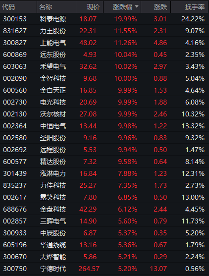 电力板块快速走强,科泰电源实现20CM涨停,远东股份、禾望电气、金智科技等多股涨停。